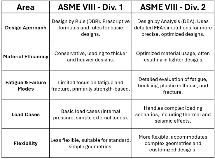 Las divisiones 1 y 2 de la Sección VIII de ASME aplican metodologías y criterios de diseño distintos, lo que permite la selección según la complejidad, el rendimiento y los requisitos del código. Las principales diferencias incluyen: